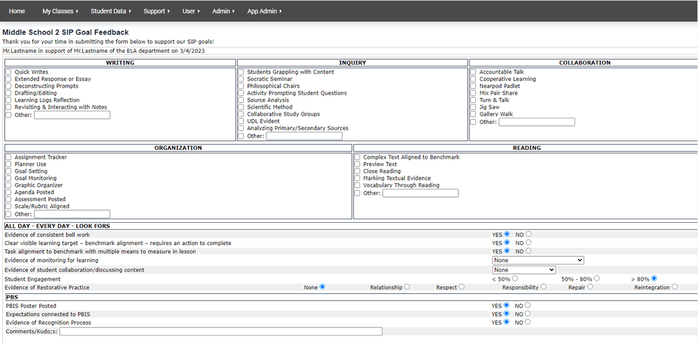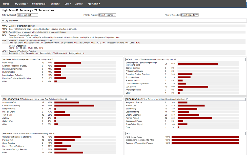 Results are automatically disaggregated according to subject, teacher and recorder which provides great school-wide support data and outstanding topics for department level PLC's. Schools.Tools is happy to modify the form, data collected and display to meet the requirements of your specific setting.